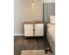 Ava King Size Bed incl Slats, 1x Small Nightstand and 1x Large Nightstand, 1x Dresser Finish: Walnut with Pearl Lacquer & Upholstery in Jalon C/60 Fabric Bed Dimensions: W88 3/4" x H59" x D85 7/8" Small Nightstand: W31 1/2" x H27 1/2" x D17 3/4" Large Nightstand: W43 3/8" x H27 1/2" x D17 3/4" Dresser: W70 7/8" x H32 1/4" x D19 5/8" Email: info@planumfurniture.com if you are interested