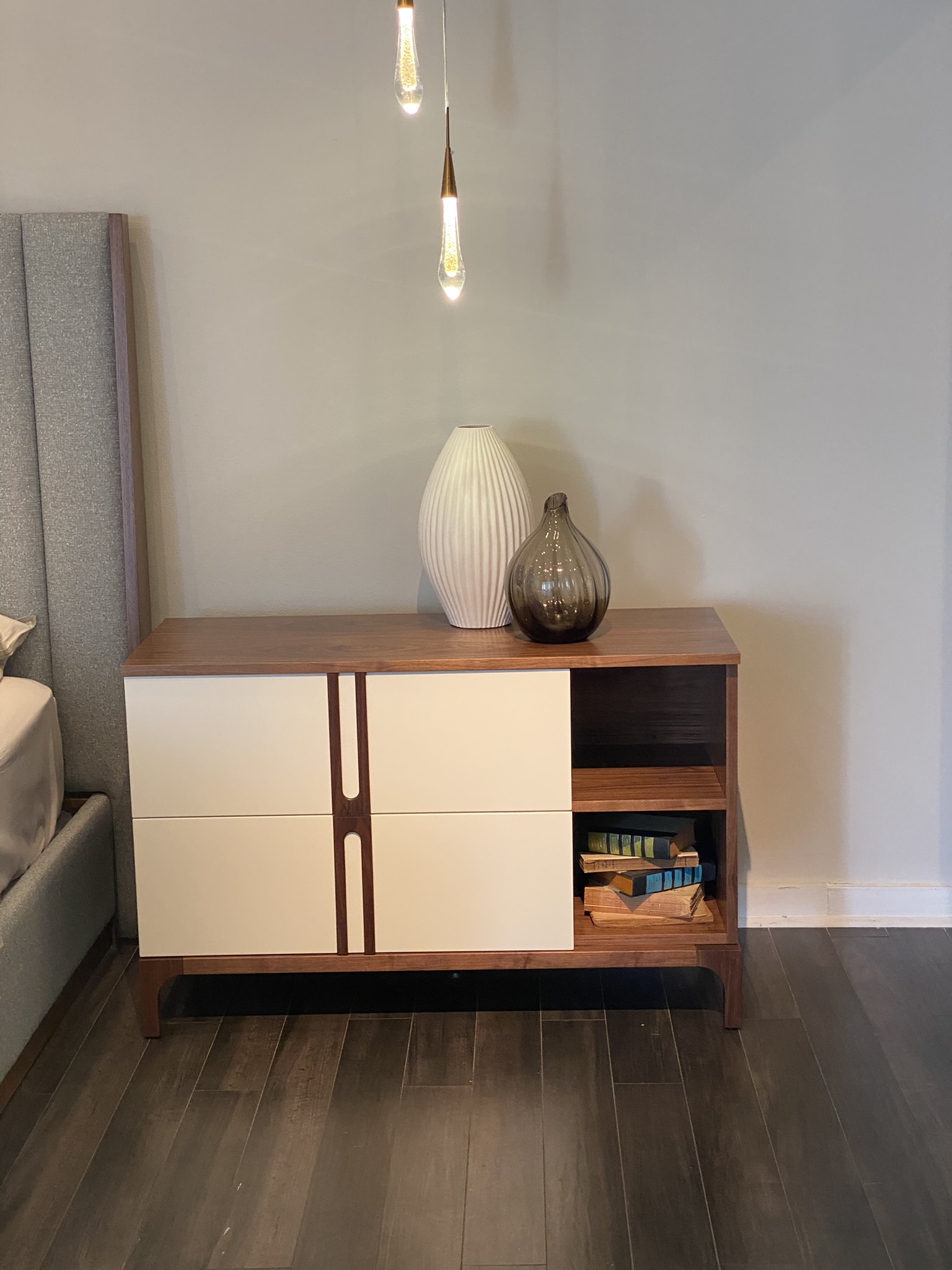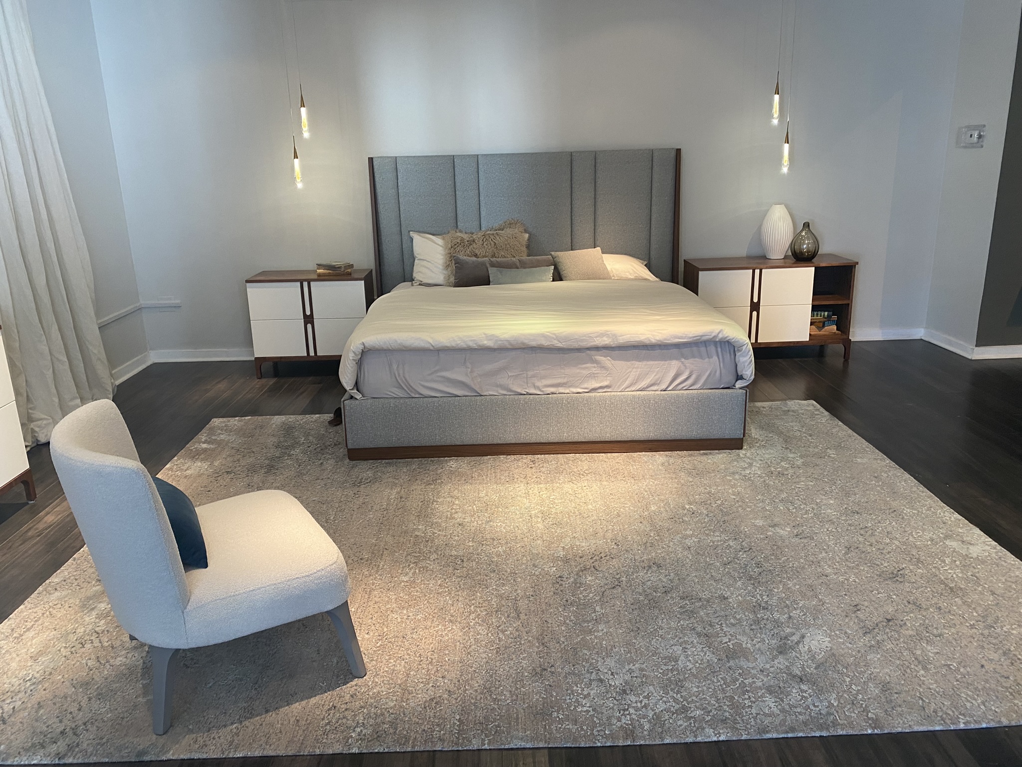 Ava King Size Bed incl Slats, 1x Small Nightstand and 1x Large Nightstand, 1x Dresser Finish: Walnut with Pearl Lacquer & Upholstery in Jalon C/60 Fabric Bed Dimensions: W88 3/4" x H59" x D85 7/8" Small Nightstand: W31 1/2" x H27 1/2" x D17 3/4" Large Nightstand: W43 3/8" x H27 1/2" x D17 3/4" Dresser: W70 7/8" x H32 1/4" x D19 5/8" Email: info@planumfurniture.com if you are interested