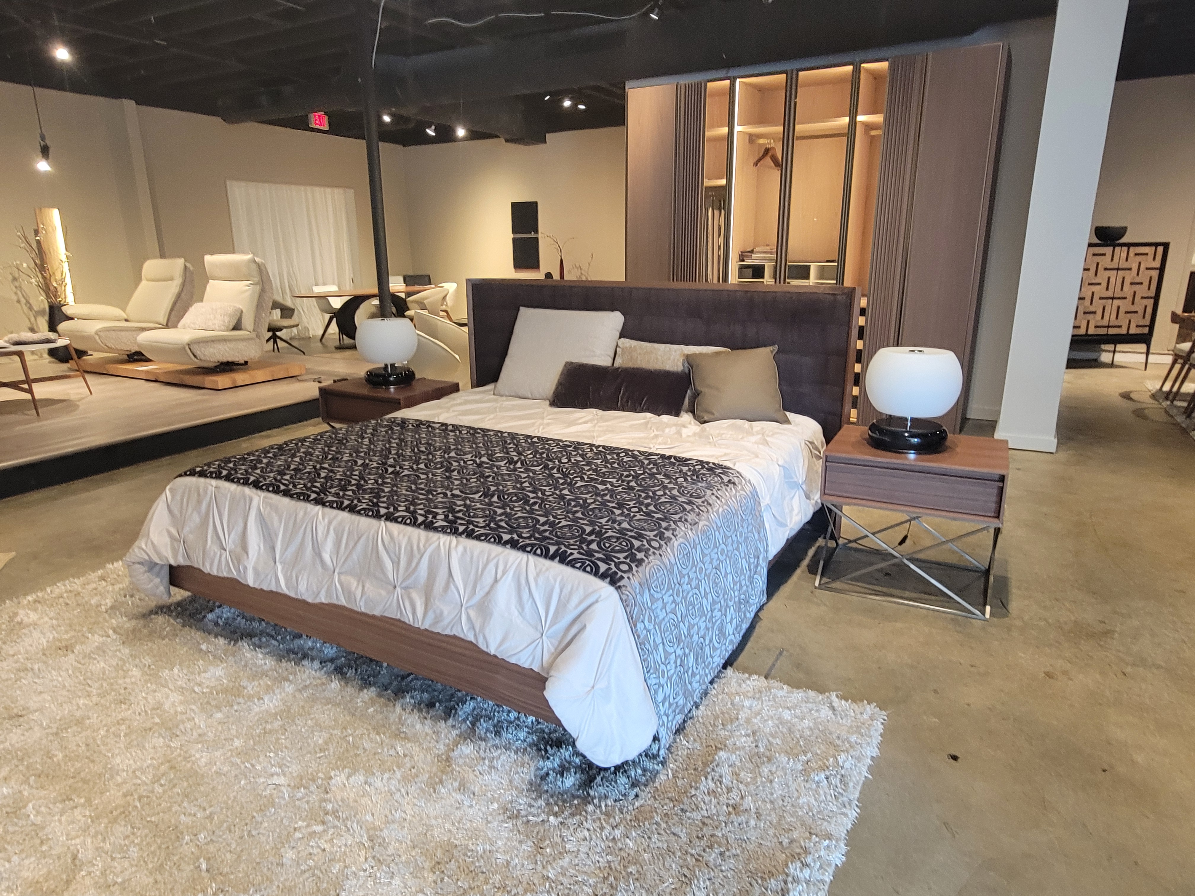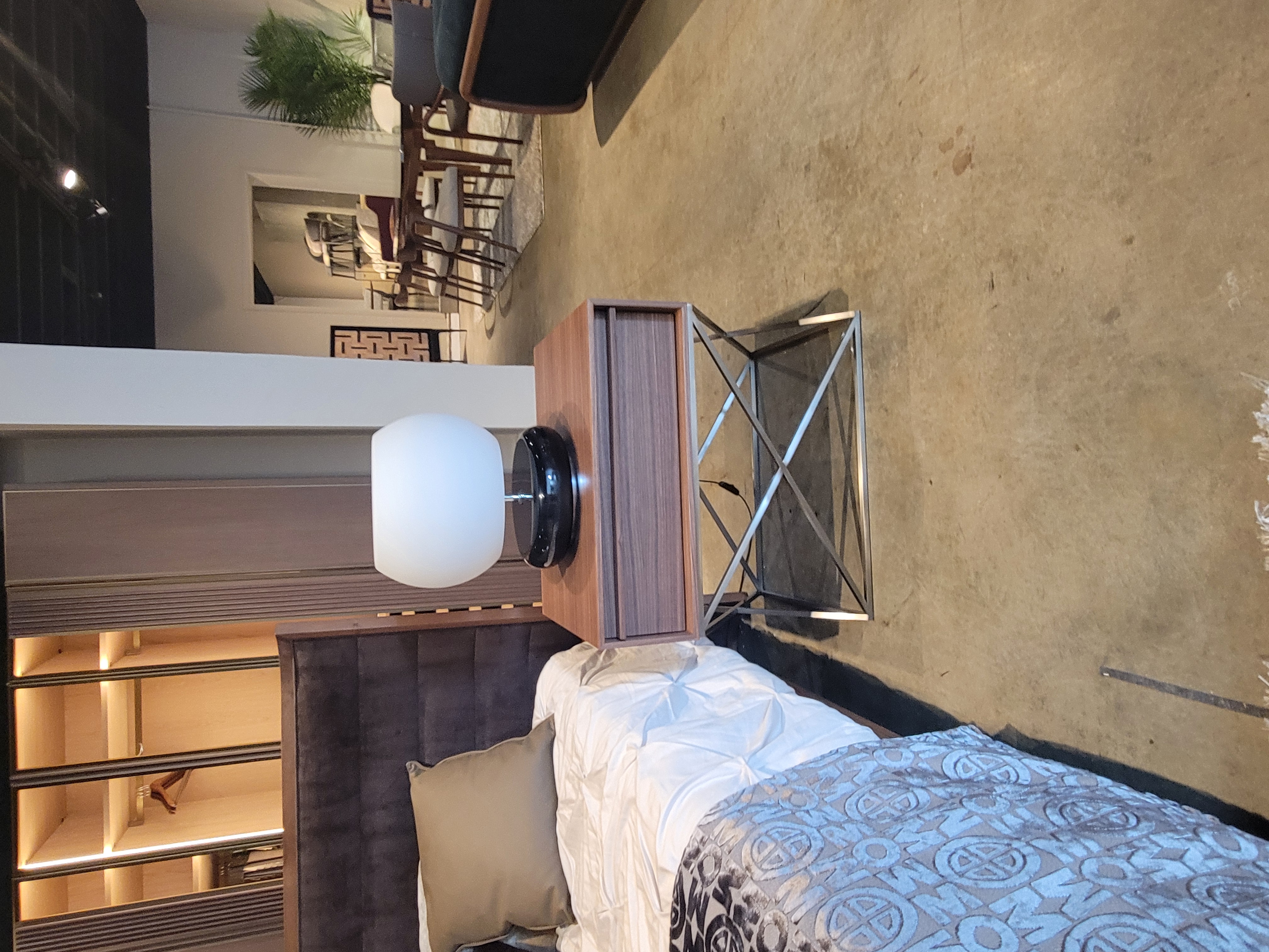Toulon King Size Bed incl Slats, 2x Nightstands Finish: American Walnut and Brushed Stainless Steel Accents with Upholstery in Fabric Capital #23 Bed Dimensions: W87 1/2" x H47" x D82 1/2" Nightstand: W25 1/2" x H23 1/2" x D19 1/2" Email: info@planumfurniture.com if you are interested