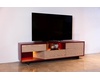Ava Media Cabinet; Finish: Case in Merlot Lacquer w/ Fronts in Fog Oak & Bronze Legs ; Sideboard Dimensions: W86 5/8" x H24" x D17 3/4" ; Email: info@planumfurniture.com if you are interested