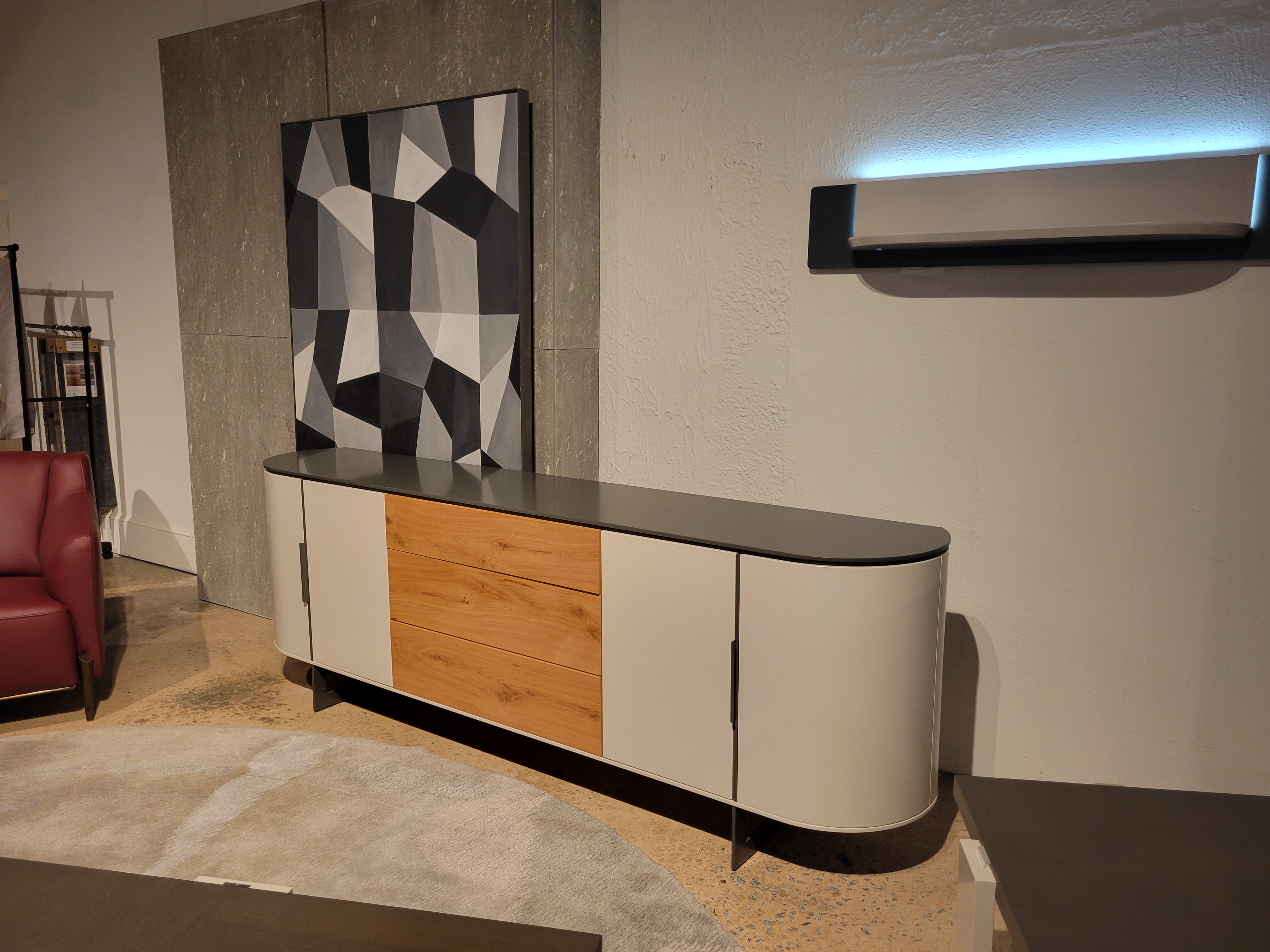 Fabio Sideboard, 3x Drawers & 4x Doors ; Finish: Top, Metal, Handles & Feet in Gun Metal Gray Lacquer, Sides in Fog Gray Lacquer w/ Drawer Fronts in Wild Oak ; Dimensions: W94 1/2" x H32 1/4" x D17 3/4" ; Email: info@planumfurniture.com if you are interested