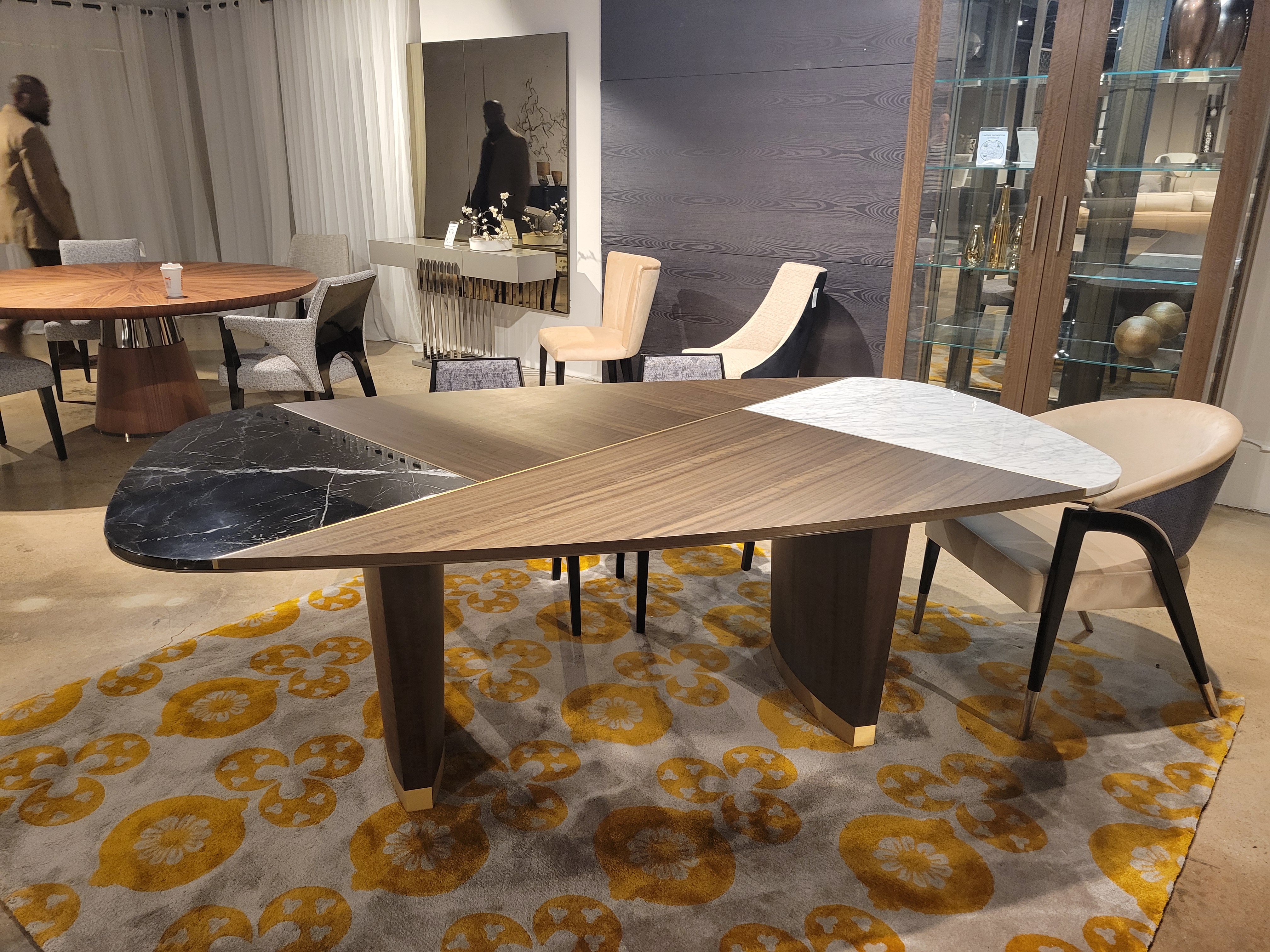 Finish: Feet & Center of Top in Grey Eucalyptus Frise with Top Ends in White and Black Marble, Feet Accents in Brushed Brass;