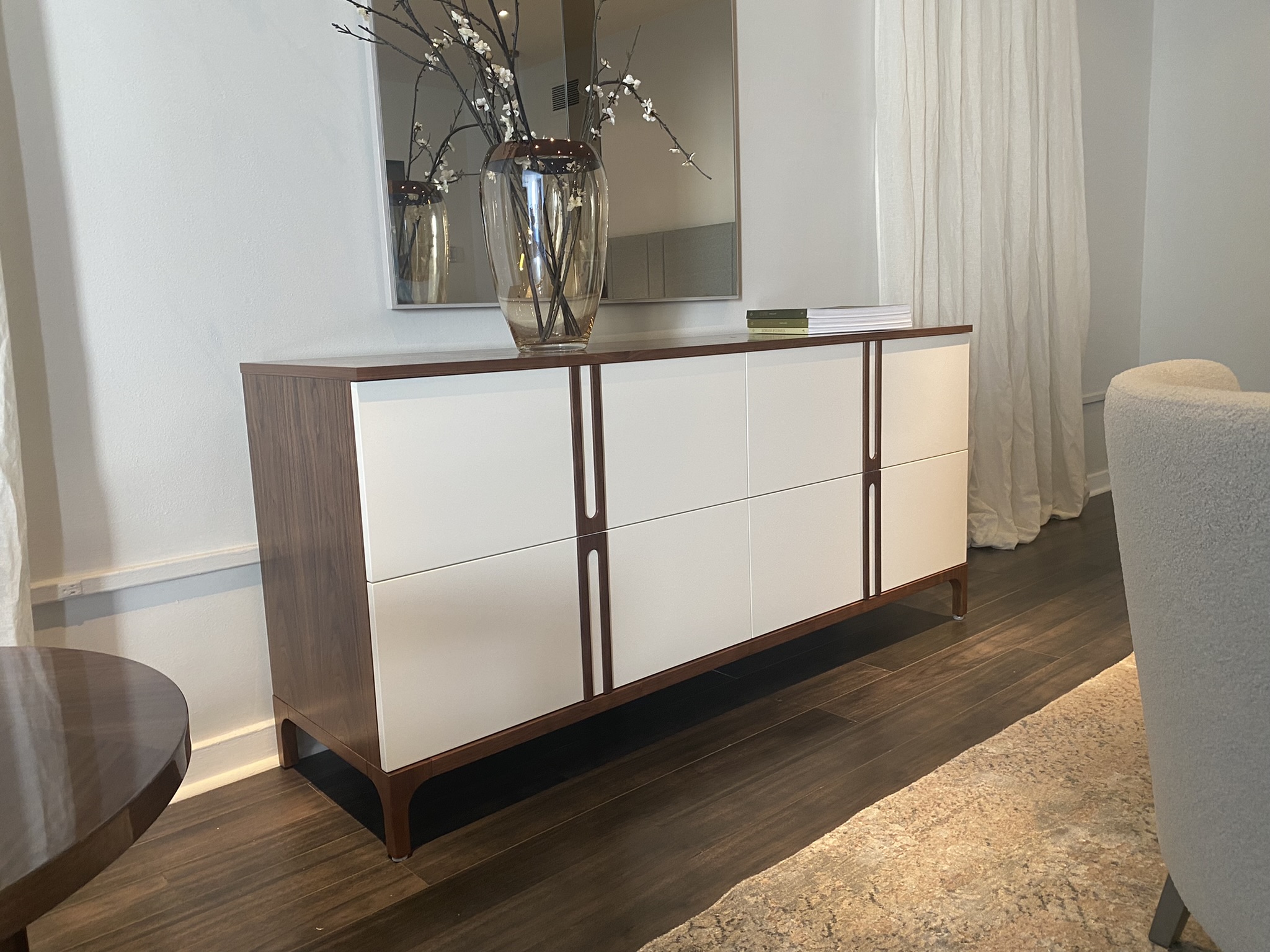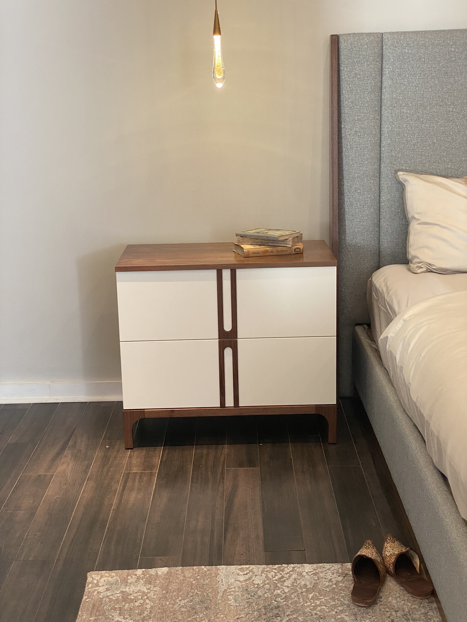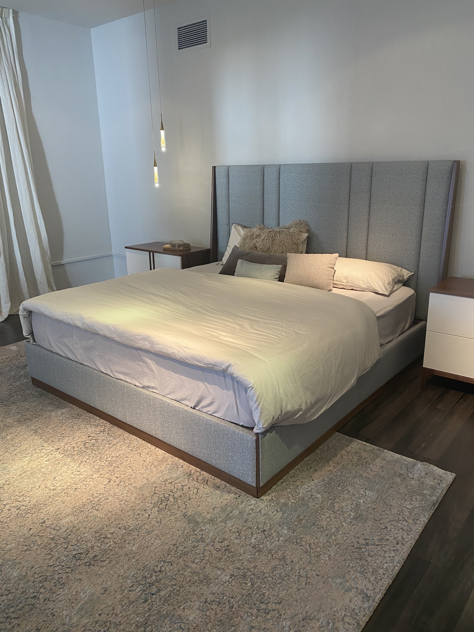 Ava King Size Bed incl Slats, 1x Small Nightstand and 1x Large Nightstand, 1x Dresser Finish: Walnut with Pearl Lacquer & Upholstery in Jalon C/60 Fabric Bed Dimensions: W88 3/4" x H59" x D85 7/8" Small Nightstand: W31 1/2" x H27 1/2" x D17 3/4" Large Nightstand: W43 3/8" x H27 1/2" x D17 3/4" Dresser: W70 7/8" x H32 1/4" x D19 5/8" Email: info@planumfurniture.com if you are interested