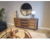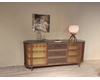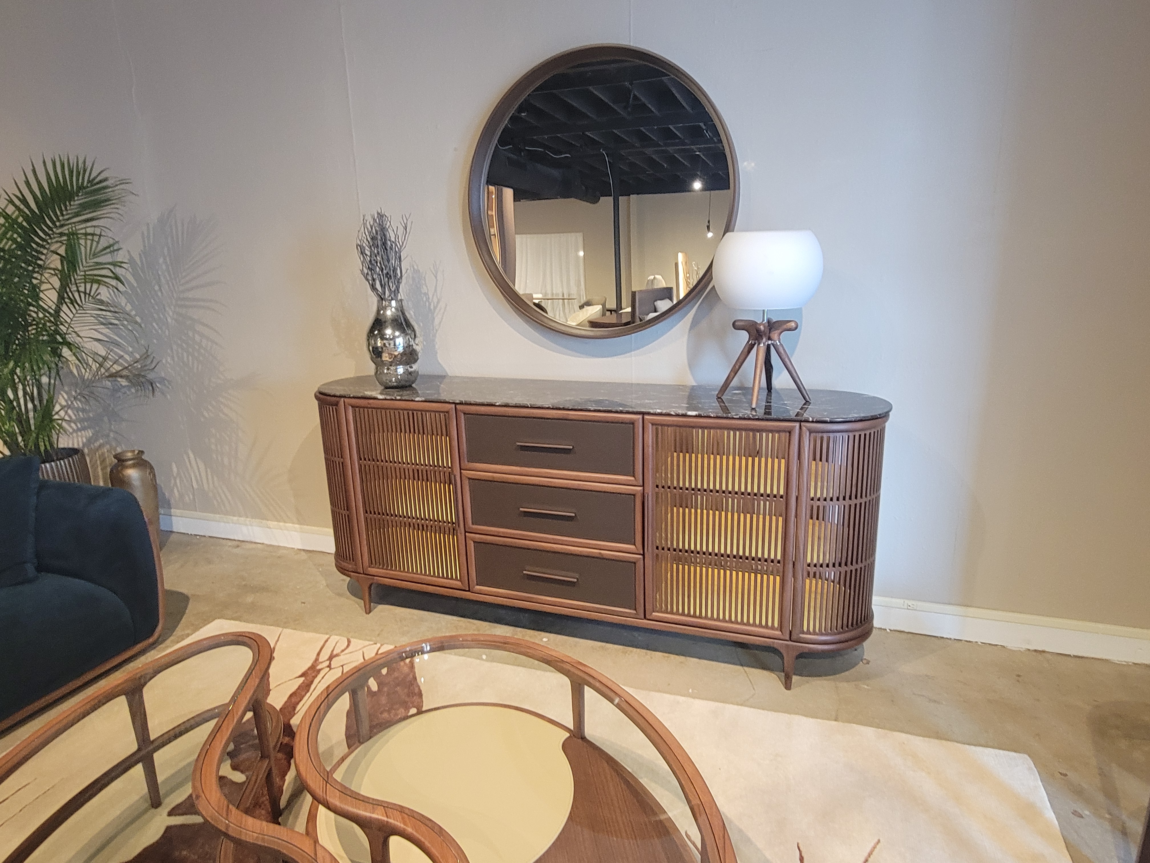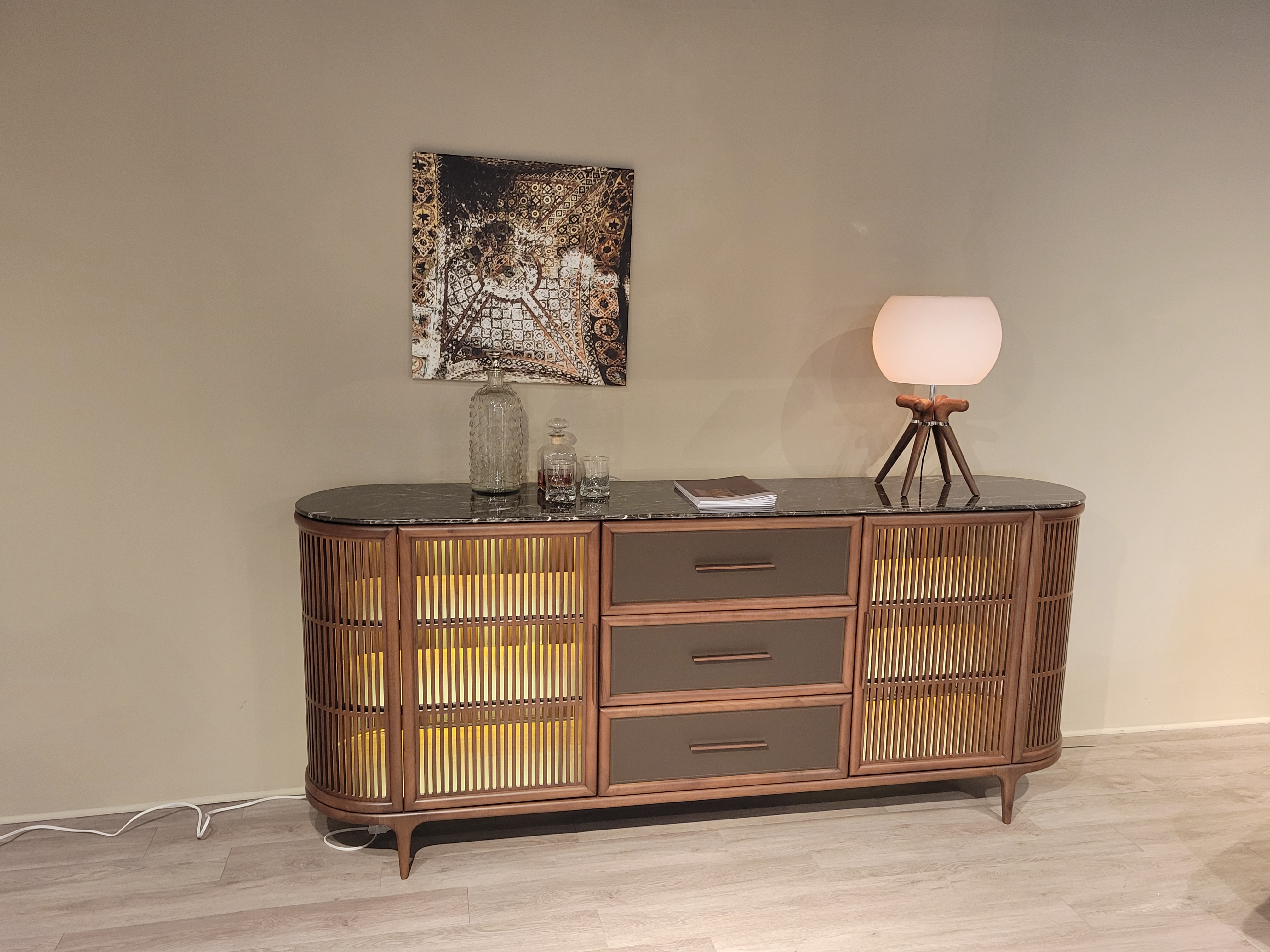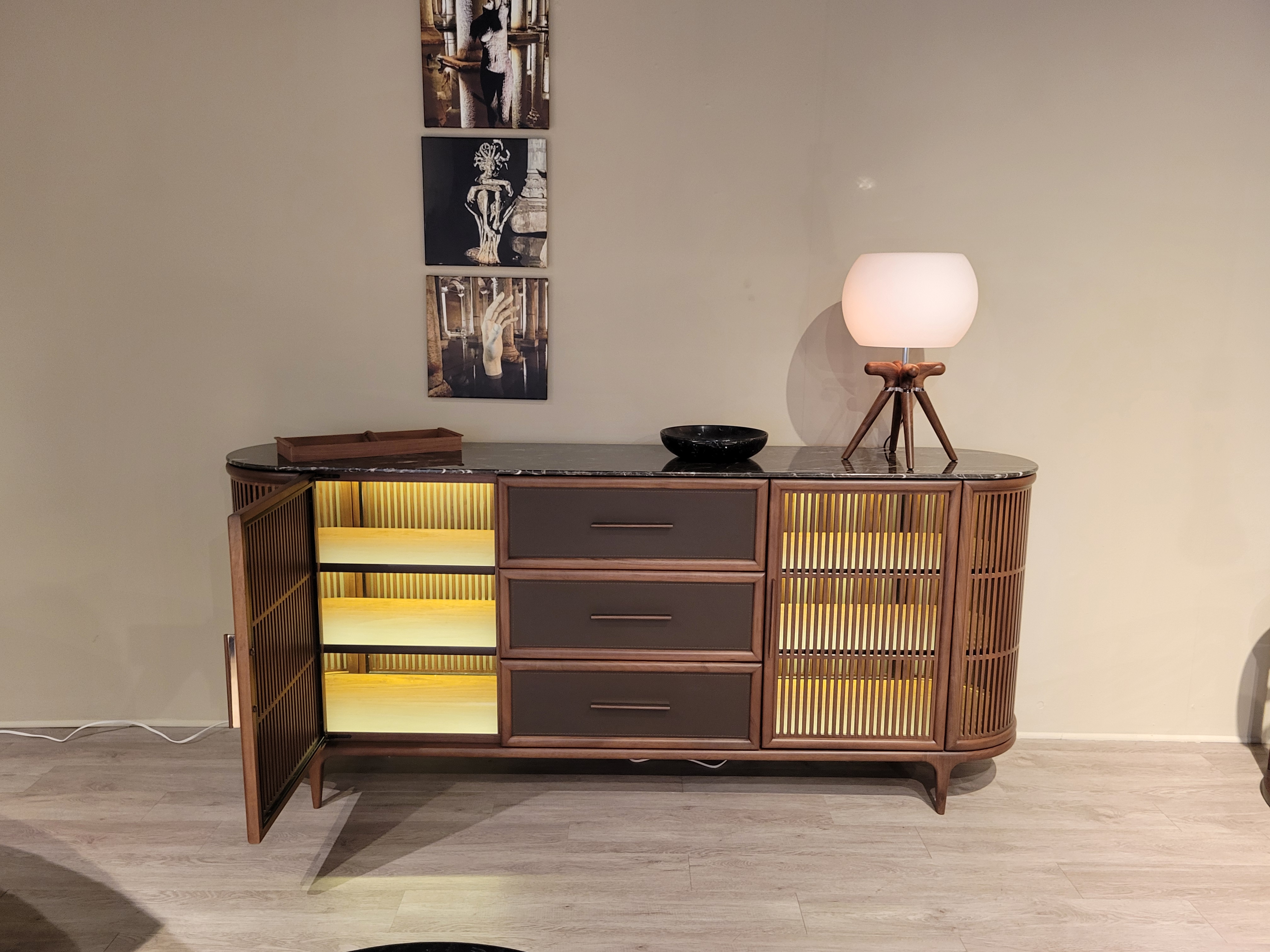 Pera Sideboard, 3x Drawers & 2x Doors ; Finish: American Walnut w/ Fronts in Faux Brown Leather, Marble Top in Black, Polished Stainless Steel Accents ; Sideboard Dimensions: W87" x H36 1/4" x D18 1/8" ; Email: info@planumfurniture.com if you are interested