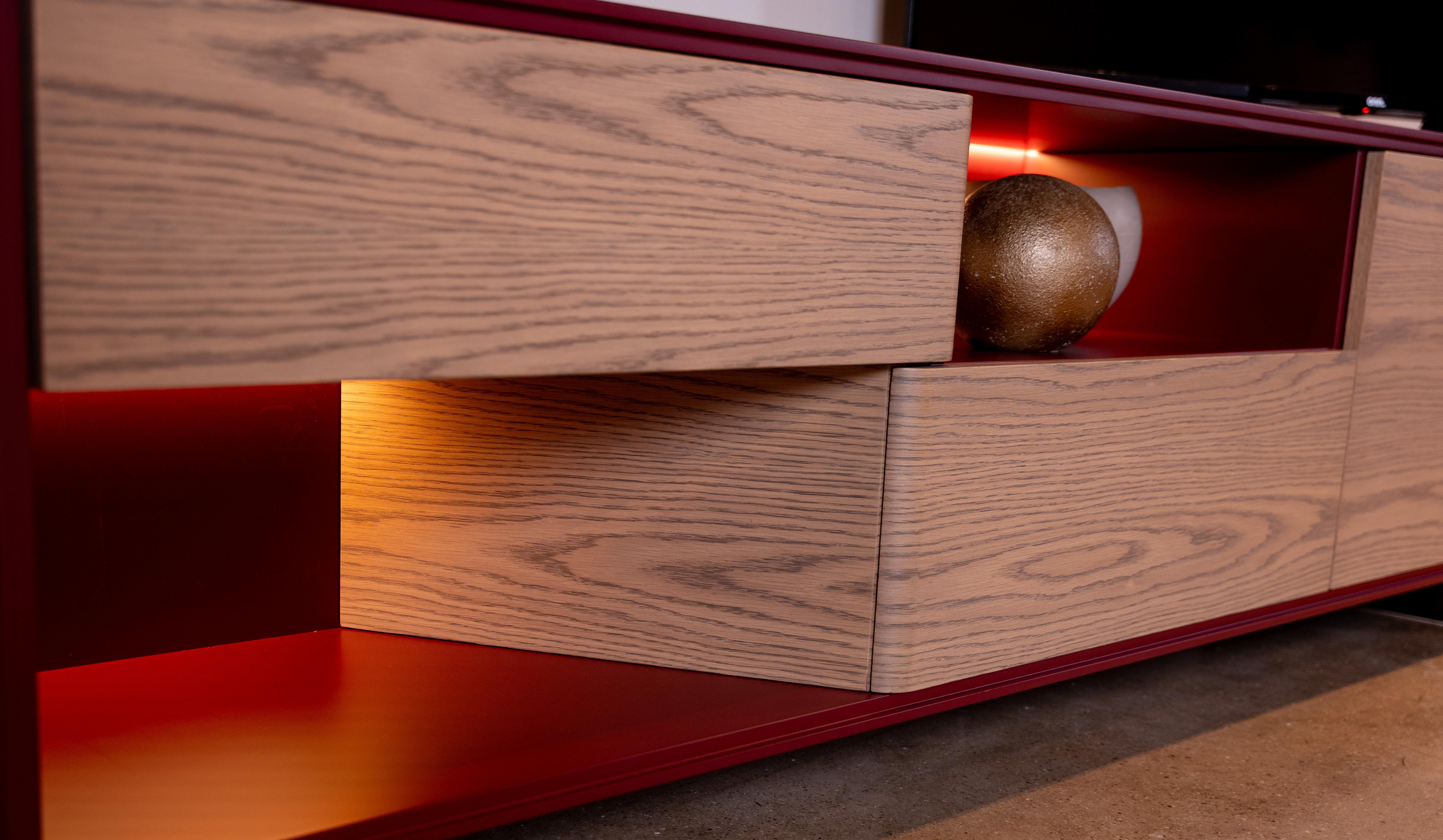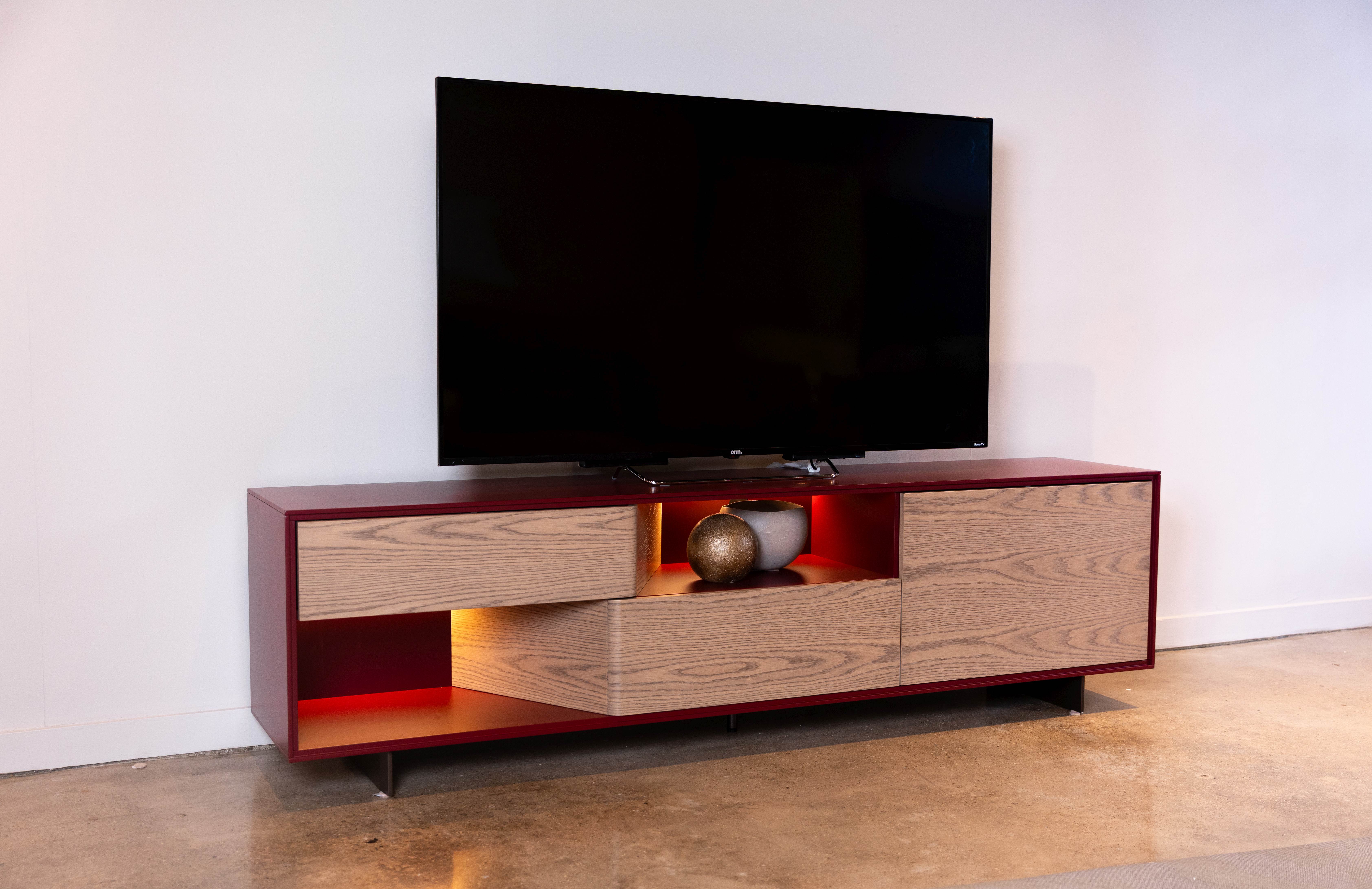 Ava Media Cabinet, 3x Drop-Lids; Finish: Case in Merlot Lacquer w/ Fronts in Fog Oak & Bronze Legs ; Sideboard Dimensions: W86 5/8" x H24" x D17 3/4" ; Email: info@planumfurniture.com if you are interested