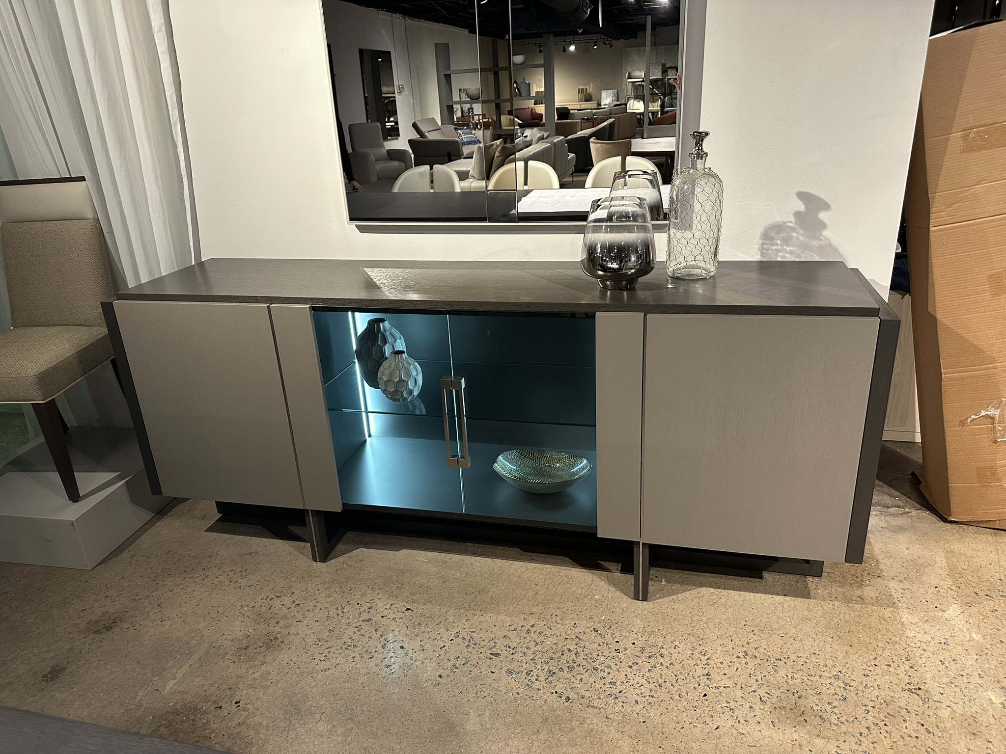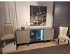 James Sideboard, 4x Doors ; Finish: Top, Sides, Legs in CV16 Oak, Fronts in CV09 Oak, Interior in Metallic Gray Lacquer w/ Grey Glass & Brushed Stainless Steel Accents ; Sideboard Dimensions: W86 5/8" x H36 1/4" x D19 5/8" ; Email: info@planumfurniture.com if you are interested