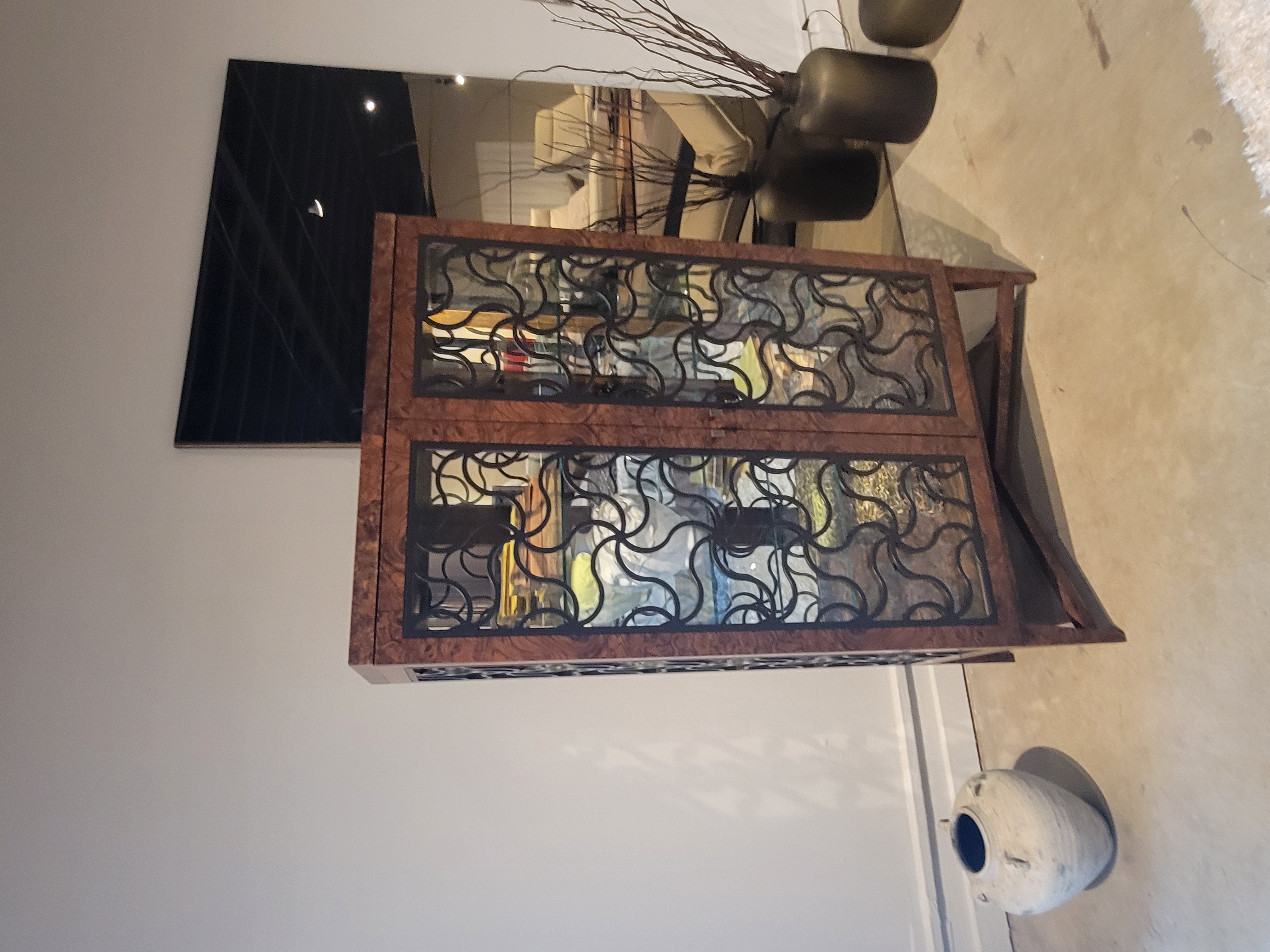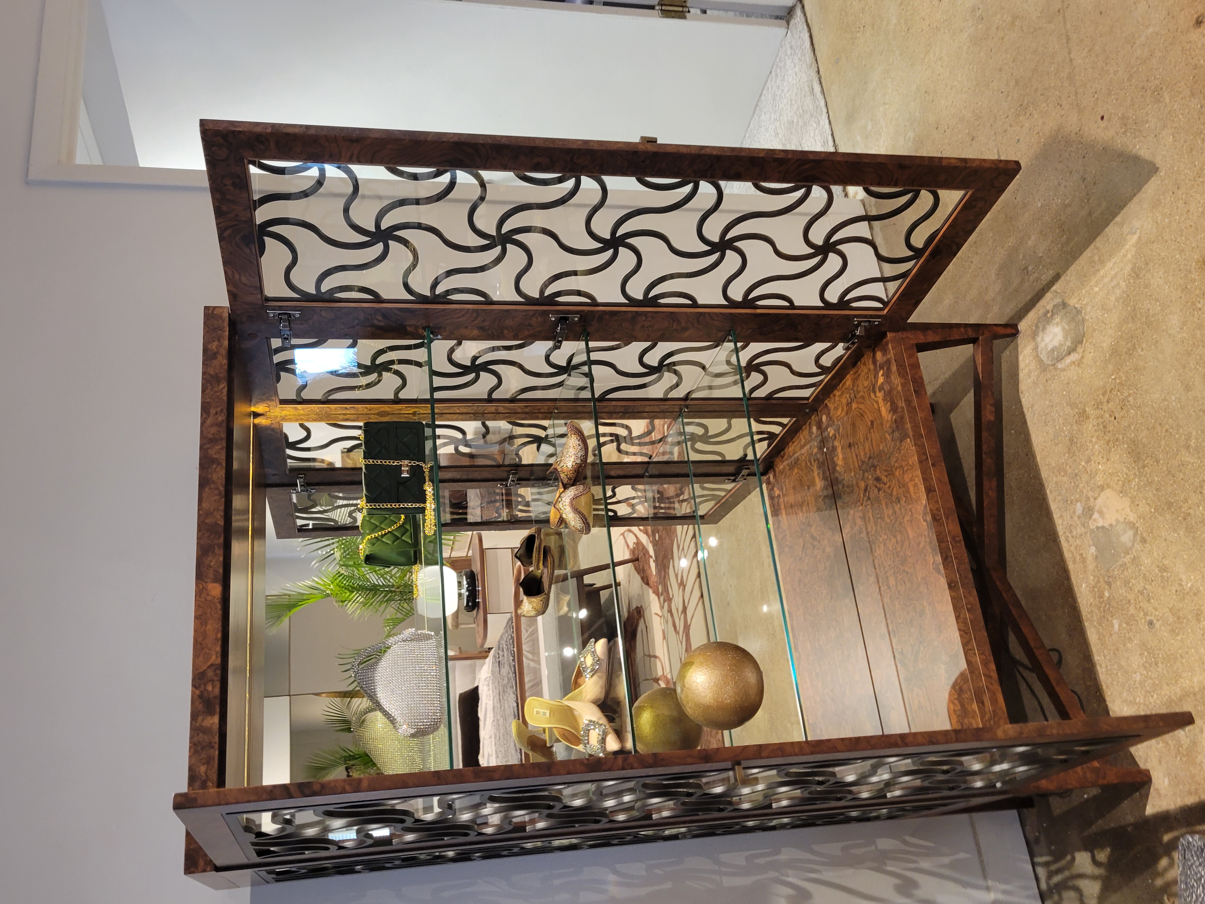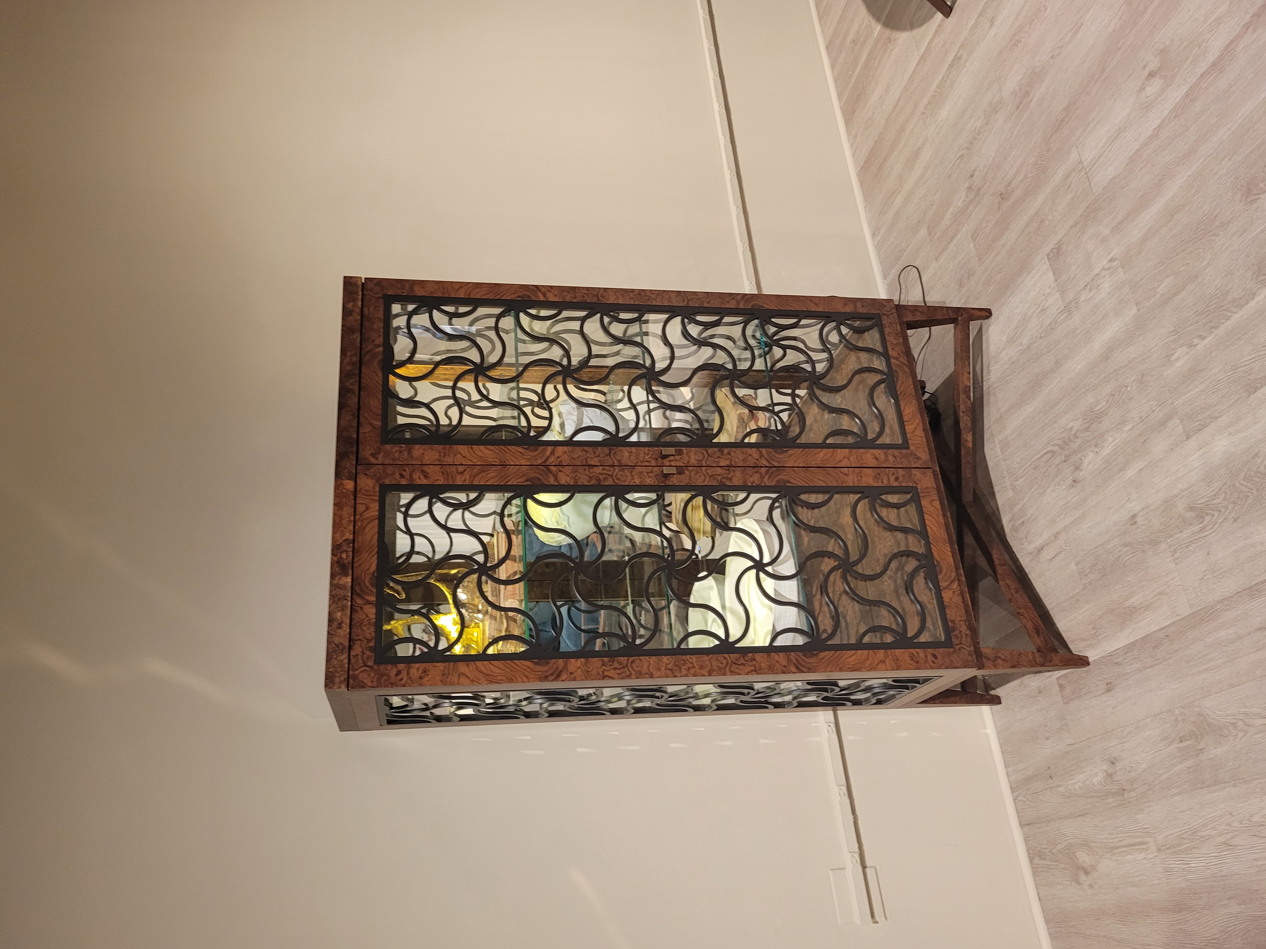 Alhambra Vitrine Cabinet, Glass Shelves & Mirrored Back ; Finish: Walnut Burl with Pattern in Lacquer #D167; Dimensions: W41" x H67" x D16 1/2" ; Email: info@planumfurniture.com if you are interested