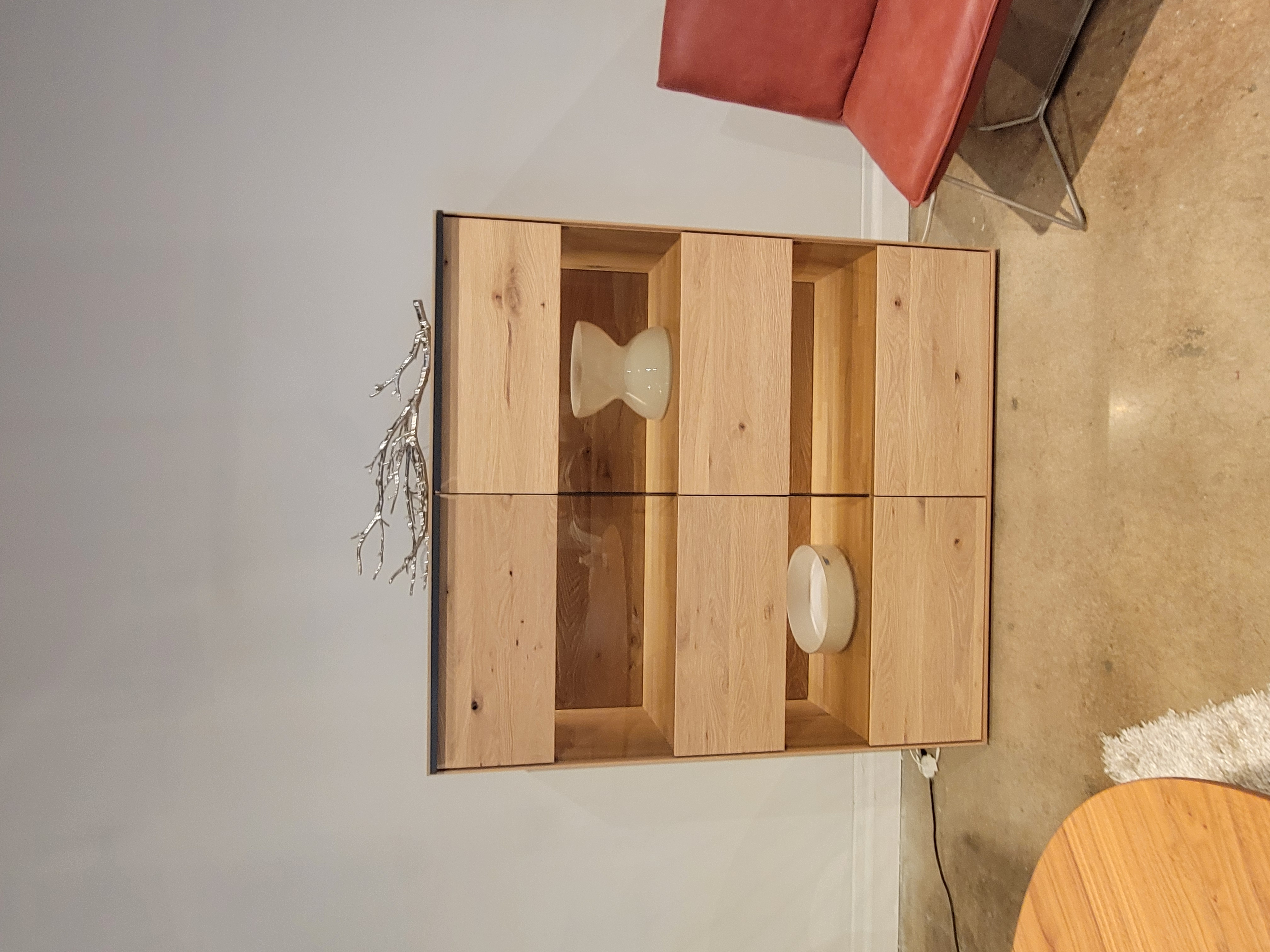 Anea Highboard, 2x Wood Shelves & 2x Glass Shelves; Finish: Solid Natural Oak w/ Back Panel in Reef Oak ; Dimensions: W51 1/8" x H57" x D17 3/8" ; Email: info@planumfurniture.com if you are interested