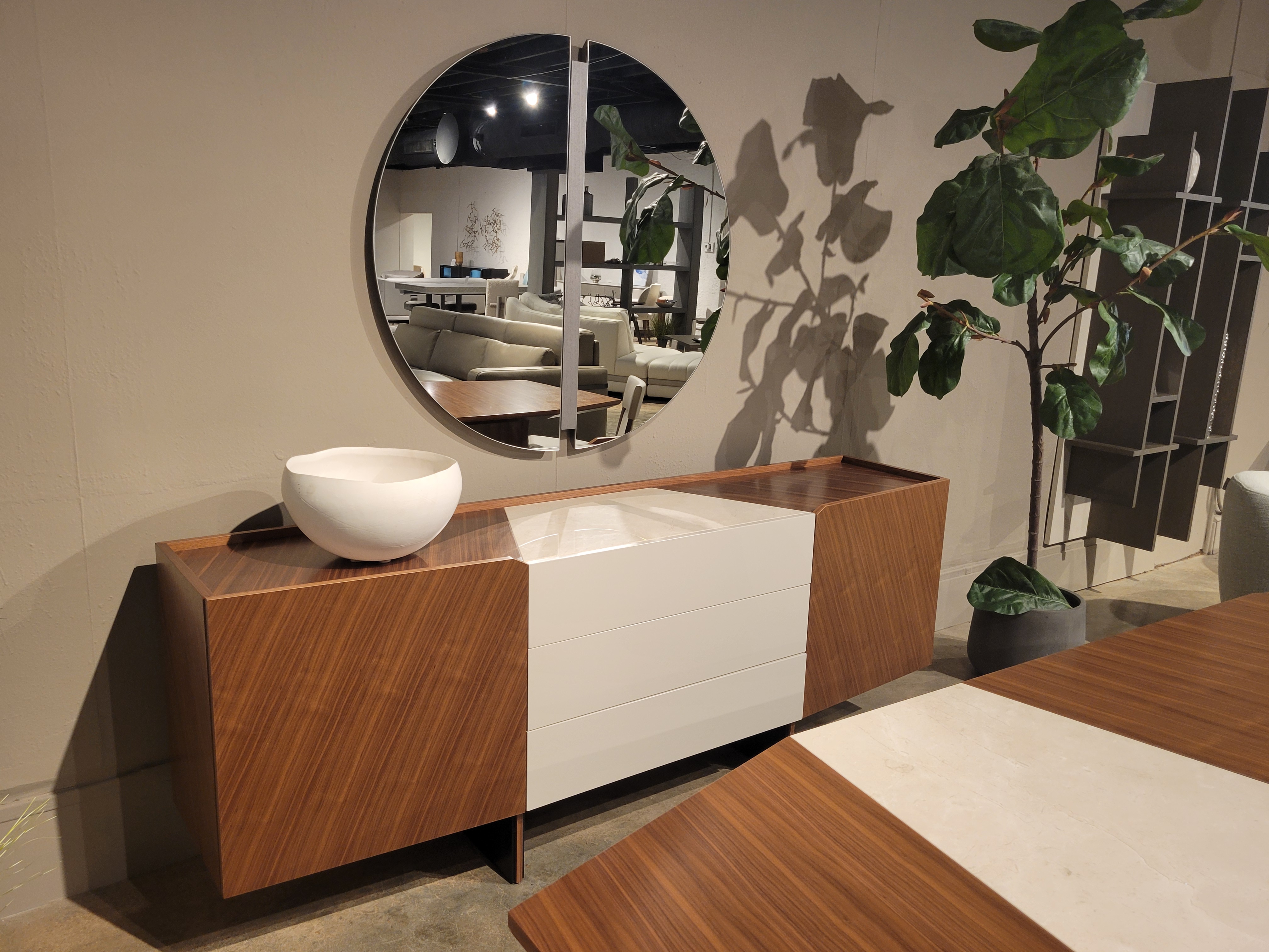 Petrah Sideboard, 3x Drawers & 2x Doors ; Finish: Top in Ivory Marble w/ Walnut Top & Case, and Drawer Fronts in Ivory Lacquer ; Sideboard Dimensions: W86 5/8" x H32 1/4" x D18 1/8" ; Email: info@planumfurniture.com if you are interested