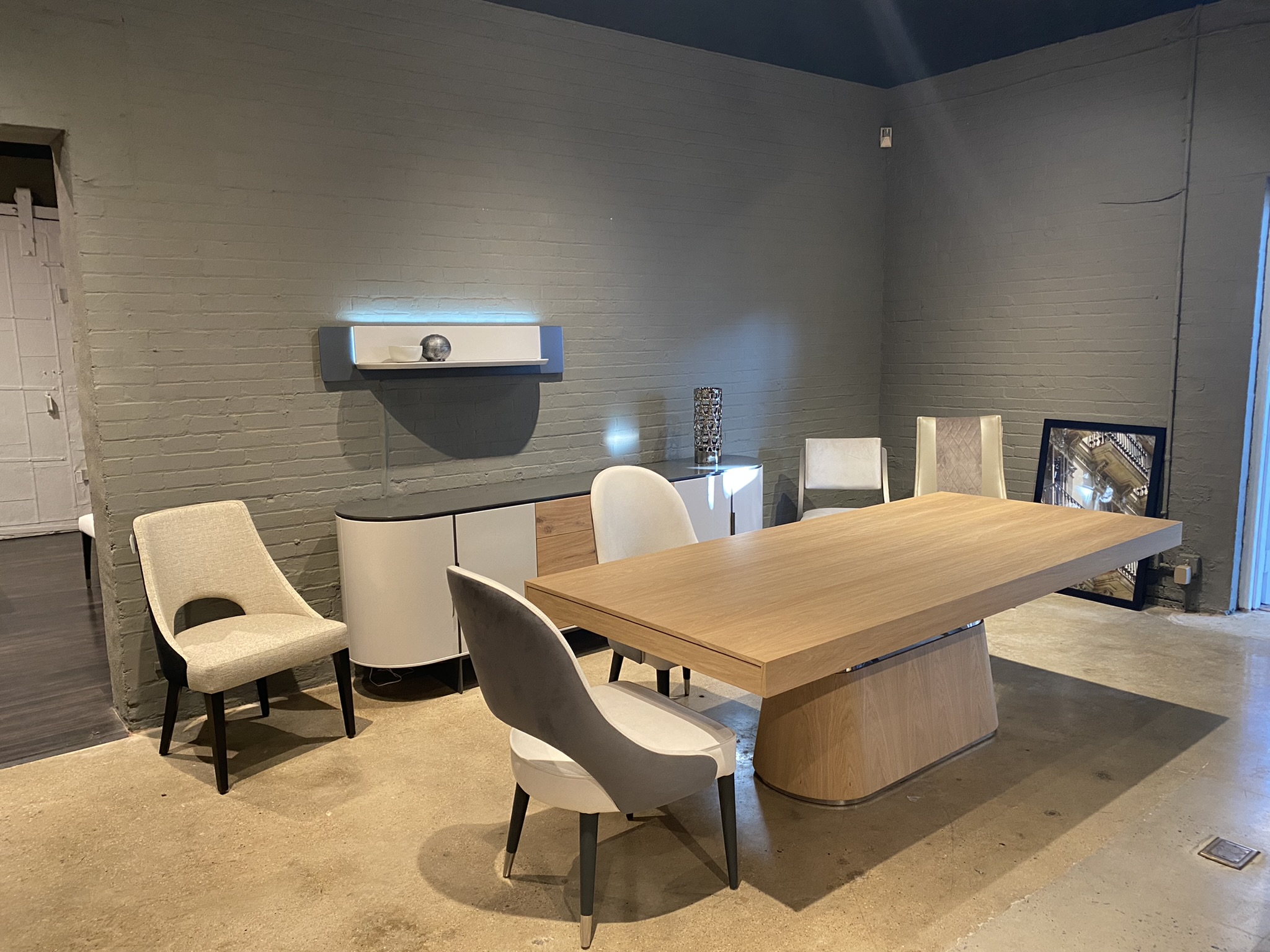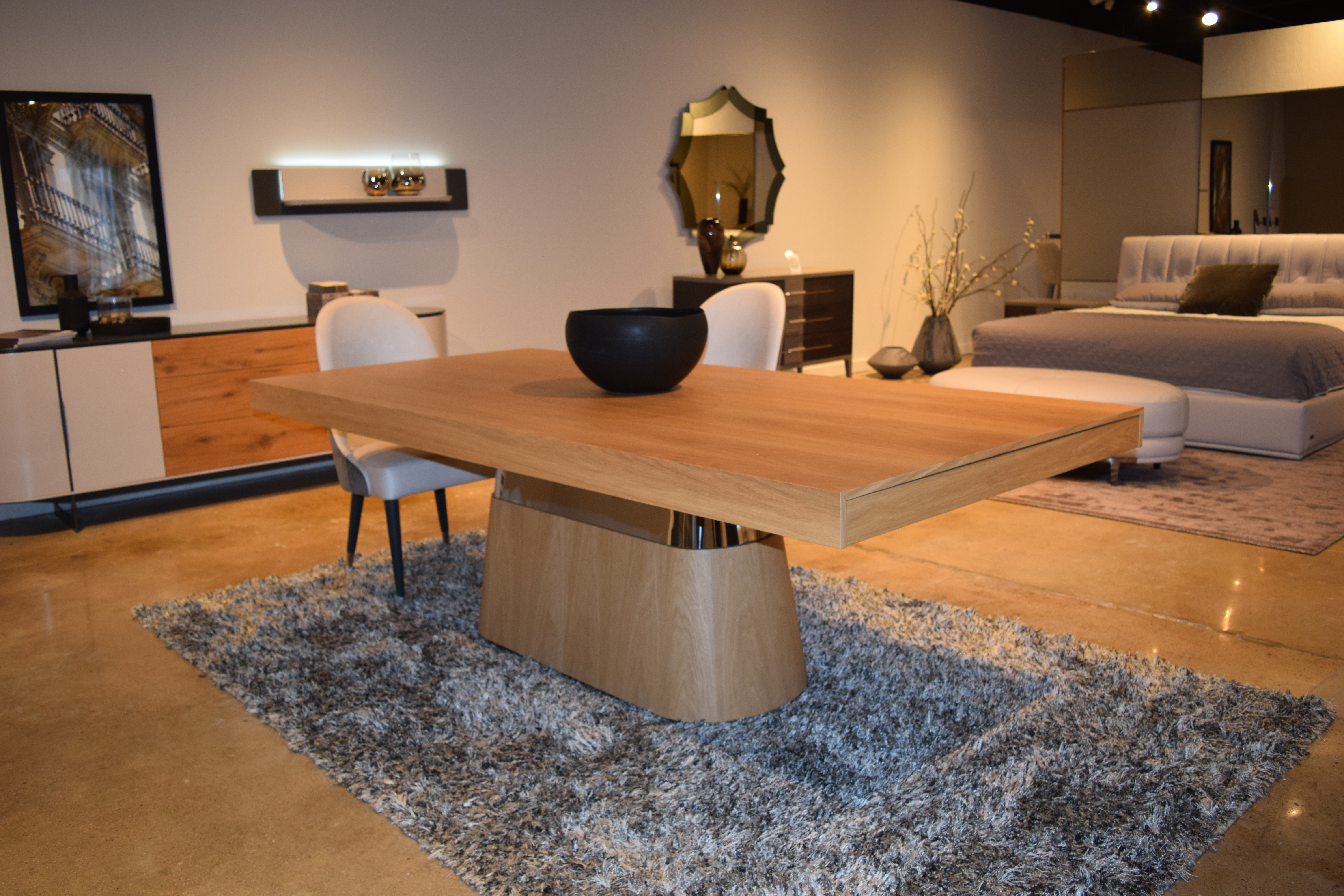 Sunset Extension Dining Table, 2x Self-Storing End Extensions ; Finish: Wild Oak w/ Polished Stainless Steel; Dimensions: W94 1/2" x H30" x D43 3/8" + 2x 19 5/8" Extension ; Email: info@planumfurniture.com if you are interested