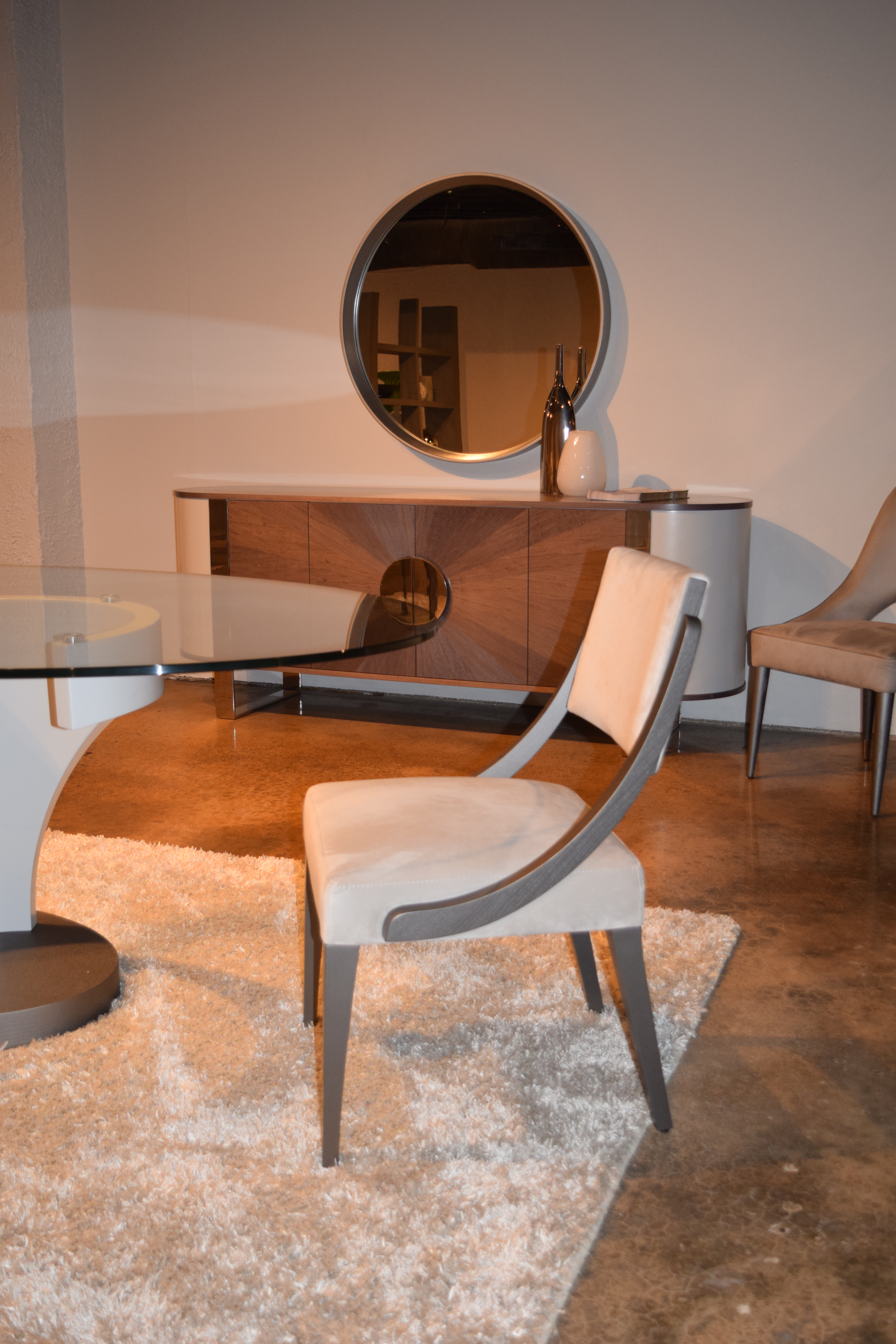 6x Charlotte Side Chairs ; Finish: Metallic Gray Lacquer w/ Fabric Rioma Velvet Lin #89 ; Dimensions: W20 7/8" x H35 7/8" x D19 1/4" ; Email: info@planumfurniture.com if you are interested