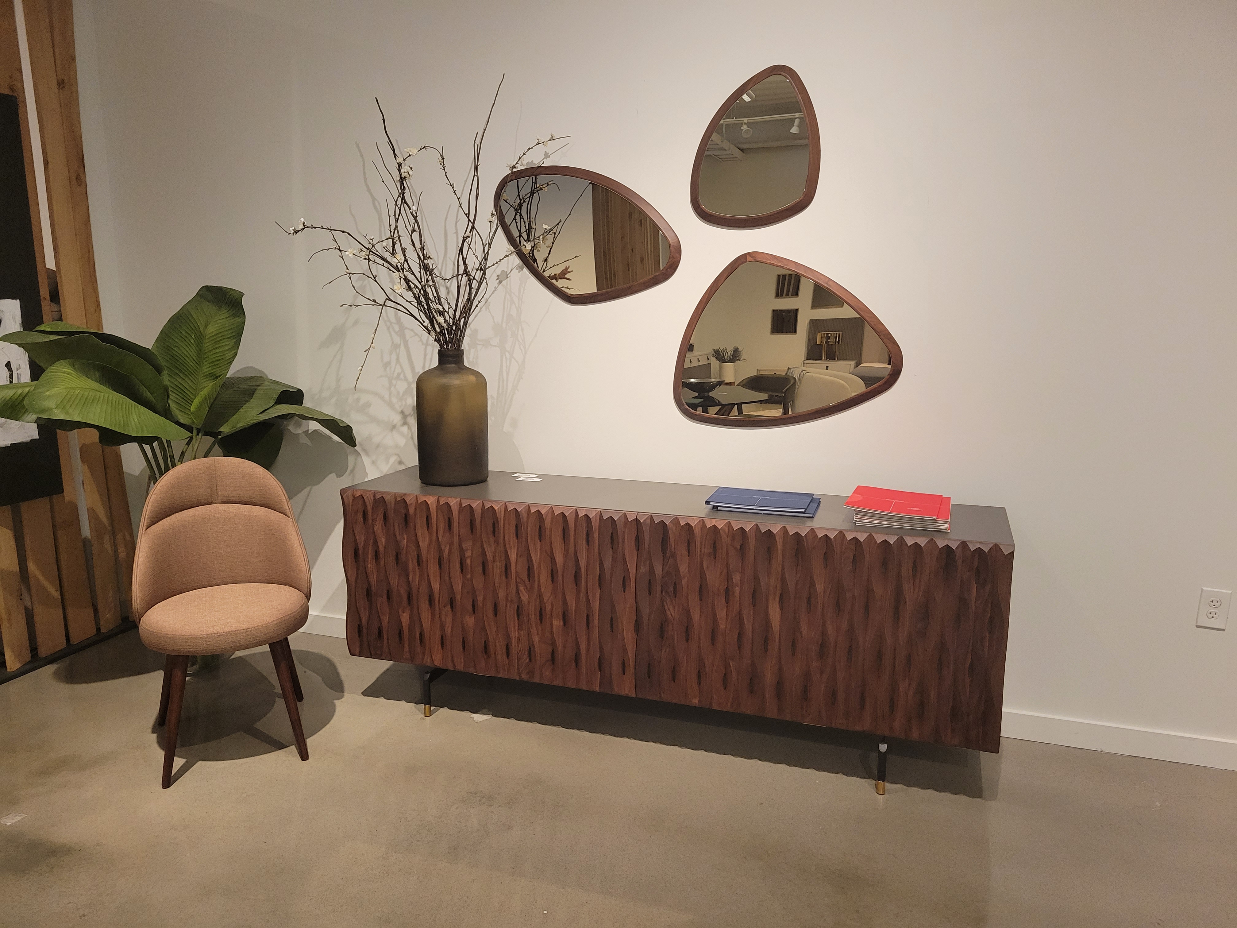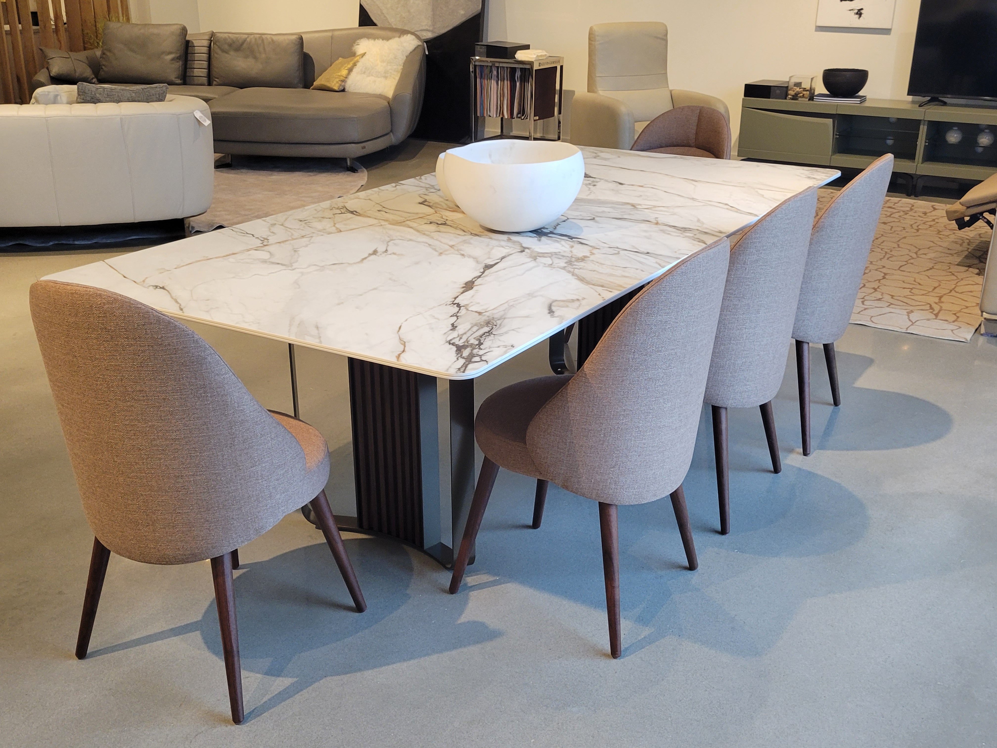 6x Fidji Side Chairs ; Finish: Legs in Walnut w/ Fabric Madeira Trufa; Dimensions: W22 5/8" x H35 1/2" x D23 5/8" ; Email: info@planumfurniture.com if you are interested