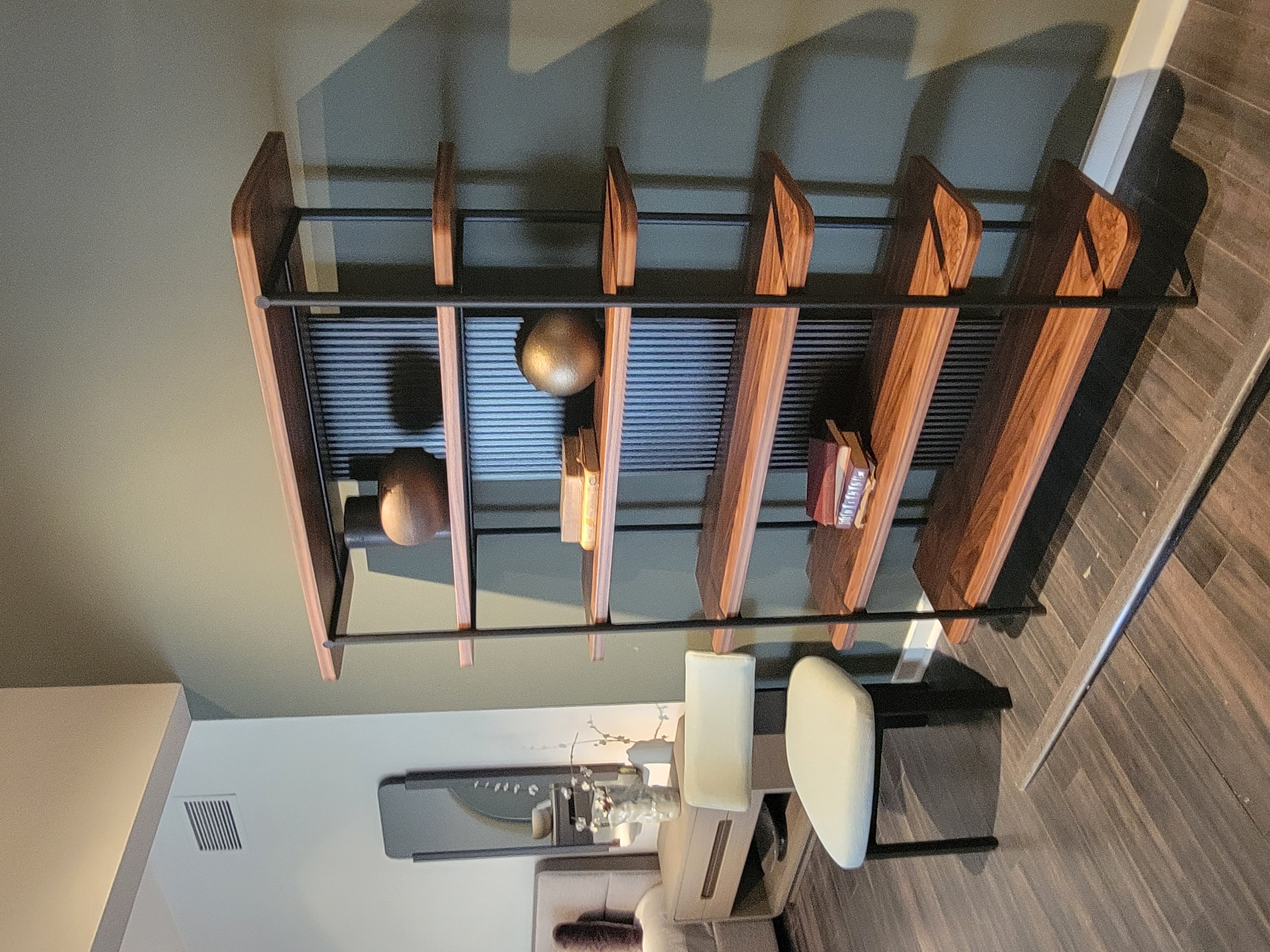 Fidji Bookshelf; Finish: Bronze Metallic Lacquer Back Panel, Walnut Shelves, Black Metal Legs w/ Bronze Sabot; Dimensions: W20 7/8" x H19 1/2" x D21 1/4" ; Email: info@planumfurniture.com if you are interested