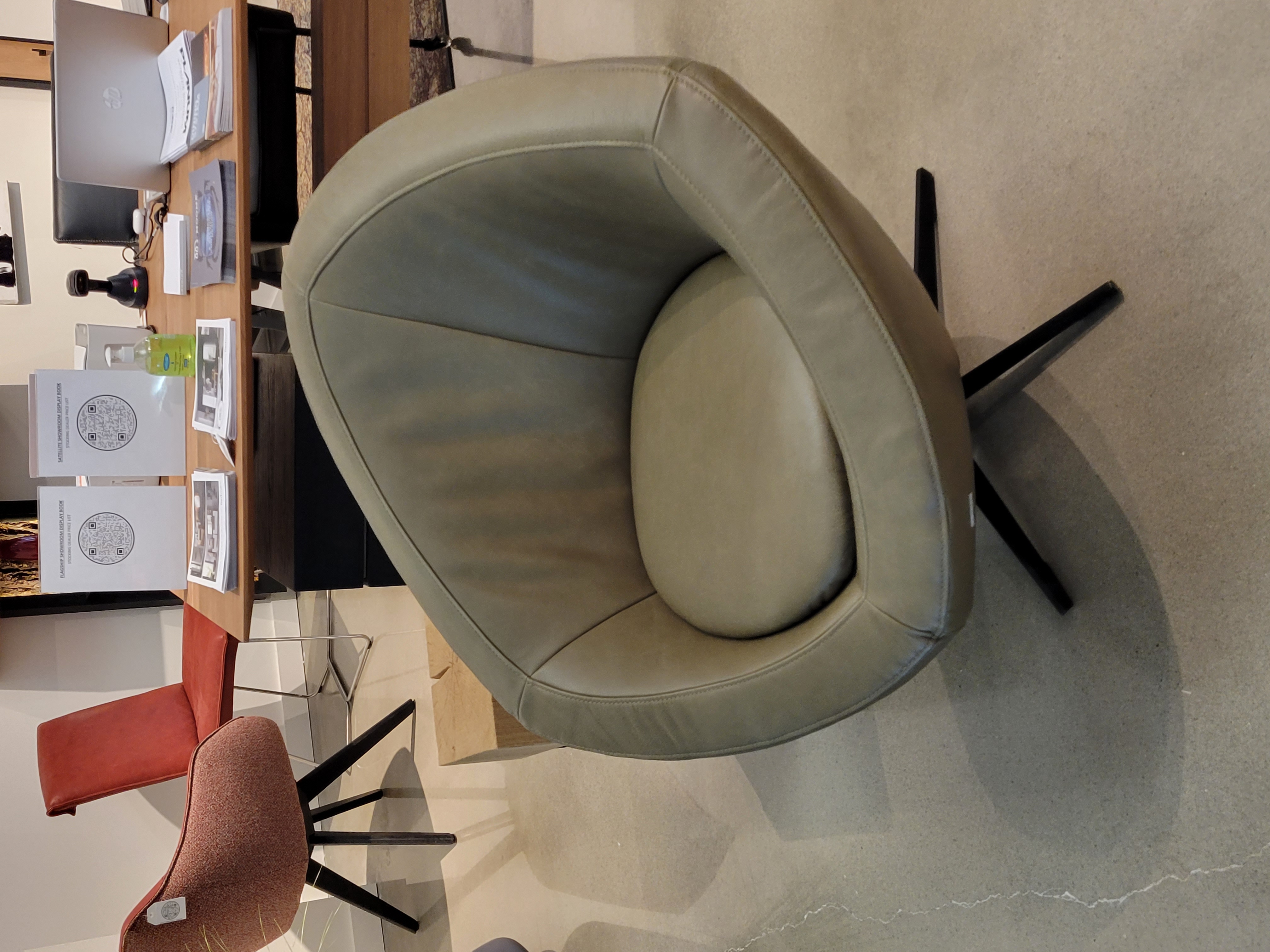 Icon Swivel Chair ; Finish: Leather Toro- Cactus w/ Matte Black Base ; Dimensions: W26 3/4" x H32 5/8" x D29 1/8" ; Email: info@planumfurniture.com if you are interested