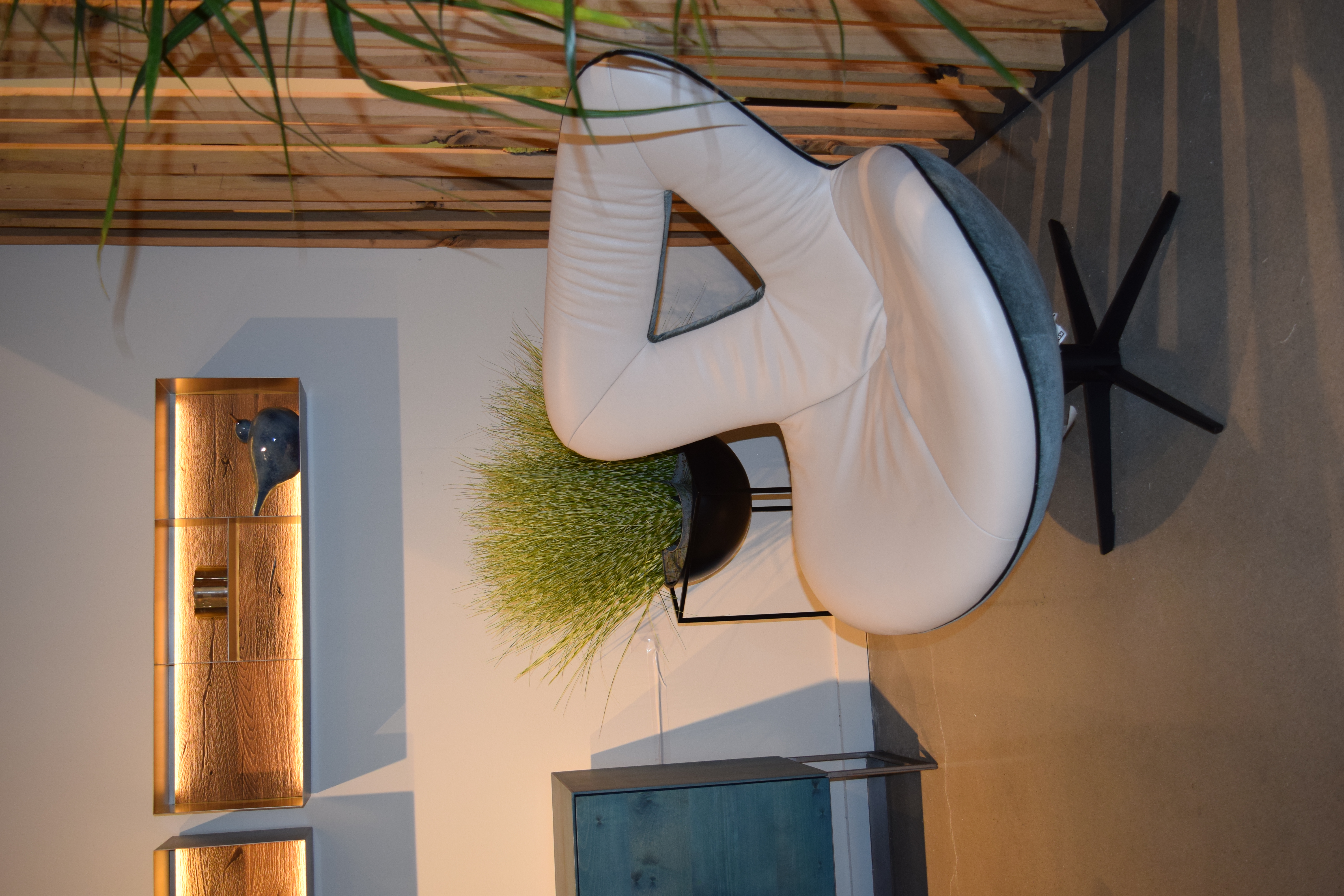 Izuu Swivel Chair ; Finish: Seat & Back in Leather A Tara- Crystal w/ Outside Back in Charmelle Cloud #20C65 & Metal legs in Powder Coated Black ; Dimensions: W33 1/2" x H38 1/4" x D35 1/2" ; Email: info@planumfurniture.com if you are interested